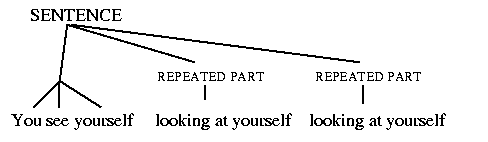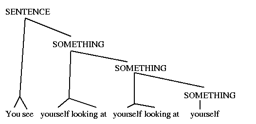 In this structure, typical of recursively defined structures, the successive instances of the SOMETHING phrase are nested inside each other, like Russian dolls. This recursive structure makes a number of combined grammatical and semantic claims. In particular, it represents the object of the main verb see as the whole rest of the sentence, and the object of the first verb looking at as the whole SOMETHING that follows it, and so on. This is correct; that is how the sentence is understood, if it is seriously taken as meaningful, rather than as merely a trick utterance which happens to repeat itself.